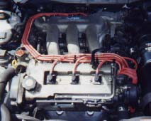 The stock plug wires started failing at roughly 42,000 miles. By 45,000, I replaced them with the well recommended Magnecor 8.5mm wires. Not only do they look cool, but they'll effectively last the life of the car. Here's what the stock wires look like: