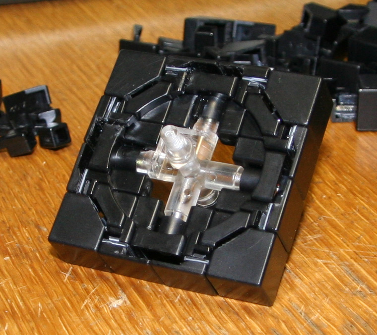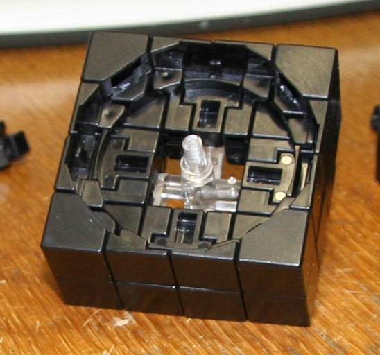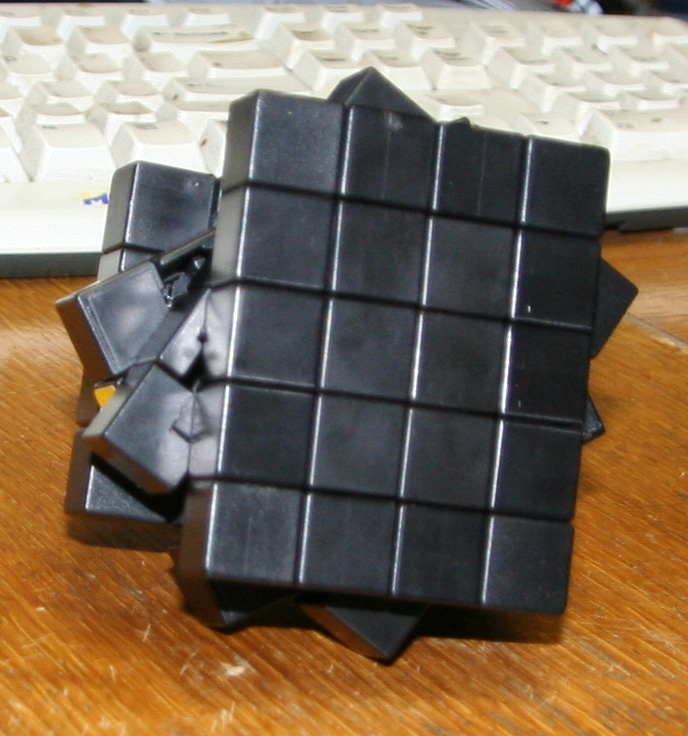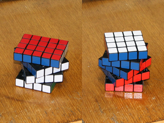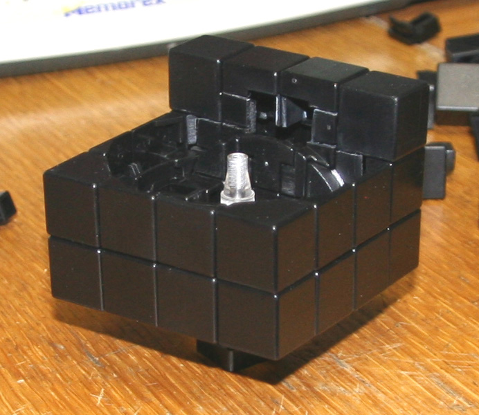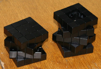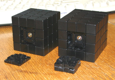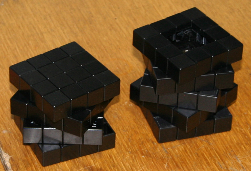 Another comparison view, showing how the pieces fit together between layers 5 and 4. The inner mechanism of the Eastsheen 4x4x4 is essentially intact. It's just that a fake layer 3 is built up while all the other layers are pushed out half a cube's width.