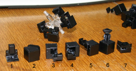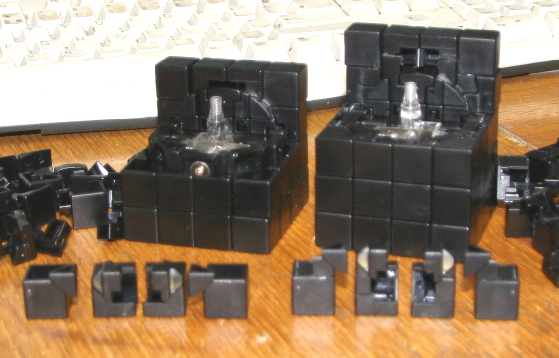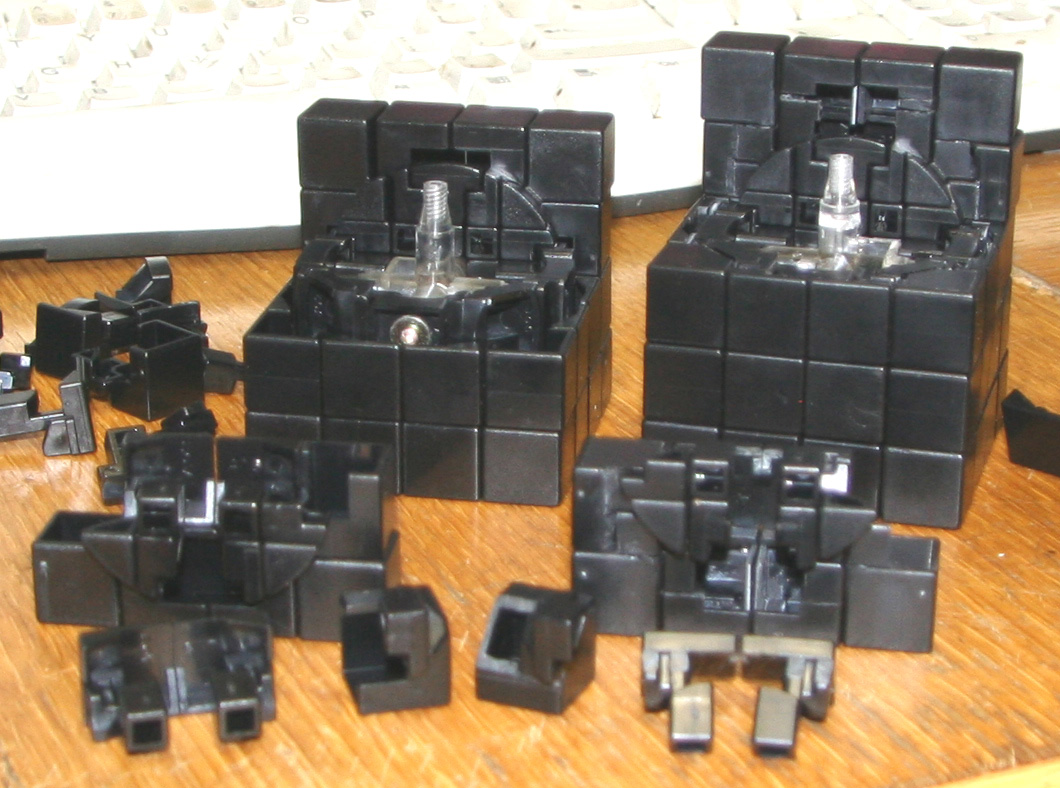 Inside of the puzzles exposed. Note the Eastsheen puzzle pieces in the foreground. Note how the 4x4x5 pieces of layers 1 and 5 are stretched out to accomodate the extra width needed with the creation of the normally invisible layer 3.