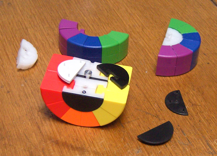 As an exercise we see here one half of a 3-layer puck that's been lightly bonded together. If you plan on using the small bearings for the "click" feel, it might not be worth it depending on how good your particular puck was to begin with. Stick a bearing only in the center hub. Putting bearings/springs into the extra layers might cause problems later due to slight gaps that may cause a bearing to jam or pop out. A different issue applies to the slice with the bearing. Depending on the position of the pieces the slices with a bearing may all end up on the same layer, thus changing the feel of the puzzle. It might be best to leave the slices completely without a bearing.