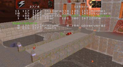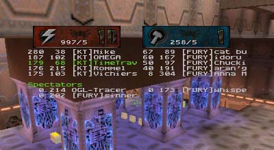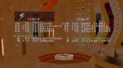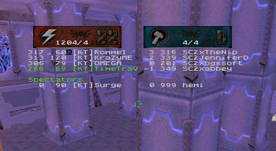 I wish I had been able to get over 300 frags as well and keep up with the other KT. As it was I fell short. Most of the map I was stuck with the Time Accelerator. Nothing wrong with that, but I was playing such close defense that I seldom had ammo and no power shield for most of the match. Often I went up to the quad and found an SC2 trying to sneak in with rockets. One or two rockets and I'd either be dead or badly hurt. Live and learn.