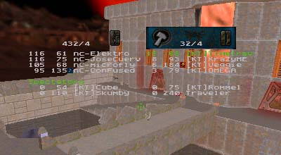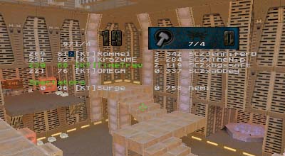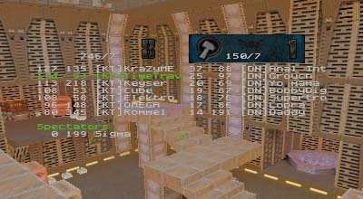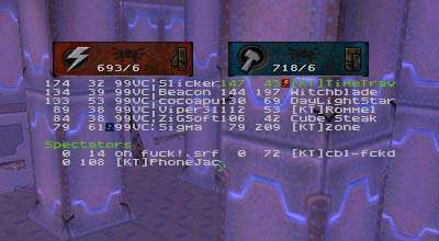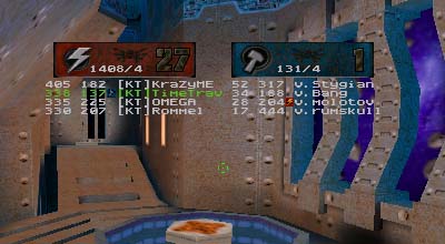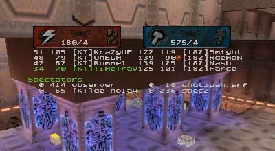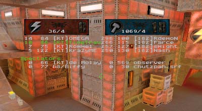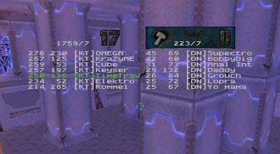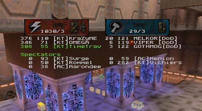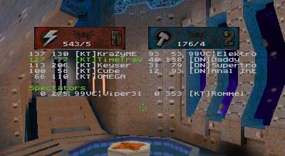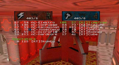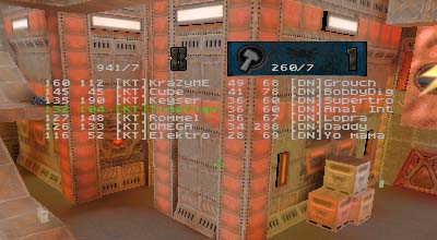Summary: This was the first match ever with 7 people as starters for each side with 99vc|Elektro helping to fill out the empty KT spot. Match started quickly for DN who immediately scored the first point. After that it was all downhill for them as KT's defenses tightened up and went on the offensive. On a couple of occasions DN managed to sneak the flag off of the pedestal but once made the mistake of trying to run it through the water pipe. Waiting at the other end were either OMEGA or KraZyME with a BFG at the ready. When the round finally ended, it was 8 to 1 in favor of KT despite Rommel's highly unstable connection.