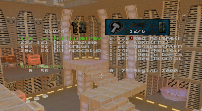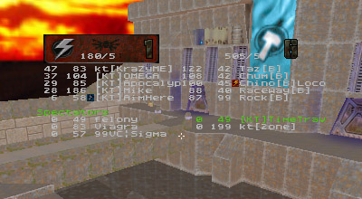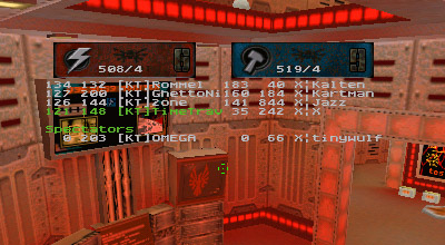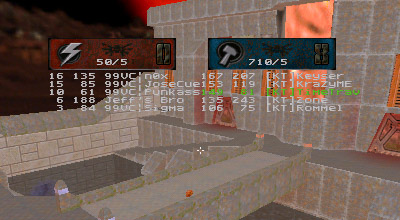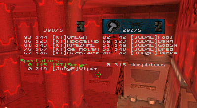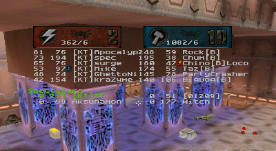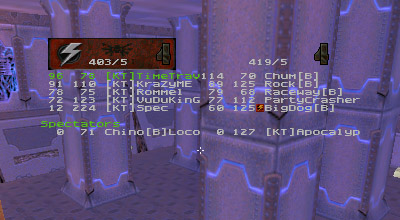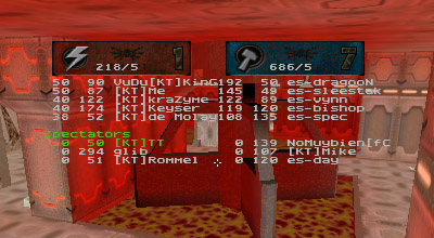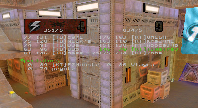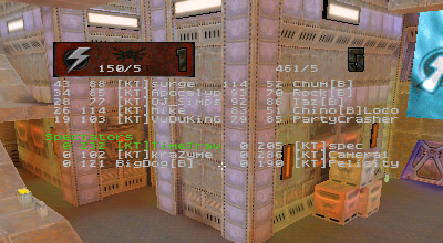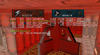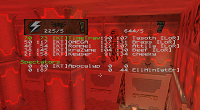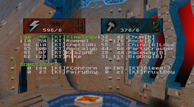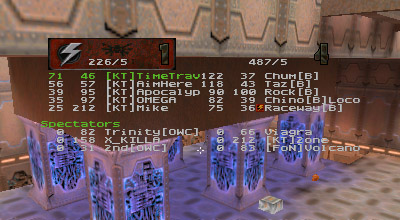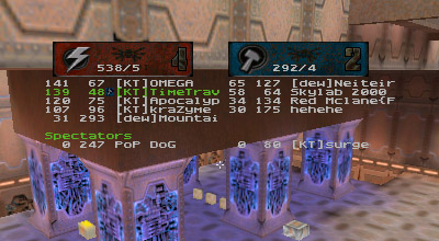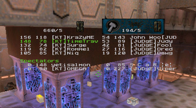 The first round battle against JuDgE was a "coming out" of sorts for the newest member of KT, Apocalypse. I've seen him play before and I was always impressed with his all around skill. Perhaps in a small case of "performance anxiety" Apoc managed to gib himself with quad rockets at least once or twice. He finally got his groove about halfway through the match and started kicking ass. Afterwards he said he just wasn't used to playing as a member of a team. He's too used to dominating and doing it all (offense, defense, capping, quad watch, etc...) by himself, apparently. Too bad it's mid-term/finals season for him, as his availability has diminished drastically.