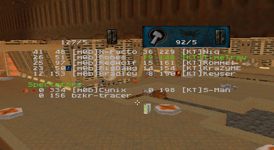 Summary: The second round was played on srf, a west coast server. I suffered effectively zero packet loss so no excuses about connection. Note the reversal in ping advantage. Although not quite as big a difference as the PMville server match, this still gives KT a decisive edge. KT scored the first 6 flag captures in the first half of the round, largely through the work of Keyser and KraZyME. Niq played strong D again and even topped the KT scoreboard with most points again. Only through perseverance did m0b managed to wrest a capture later. For the last several minutes of the match, it was a stalemate with me holding their flag and a m0b guy holding ours.
